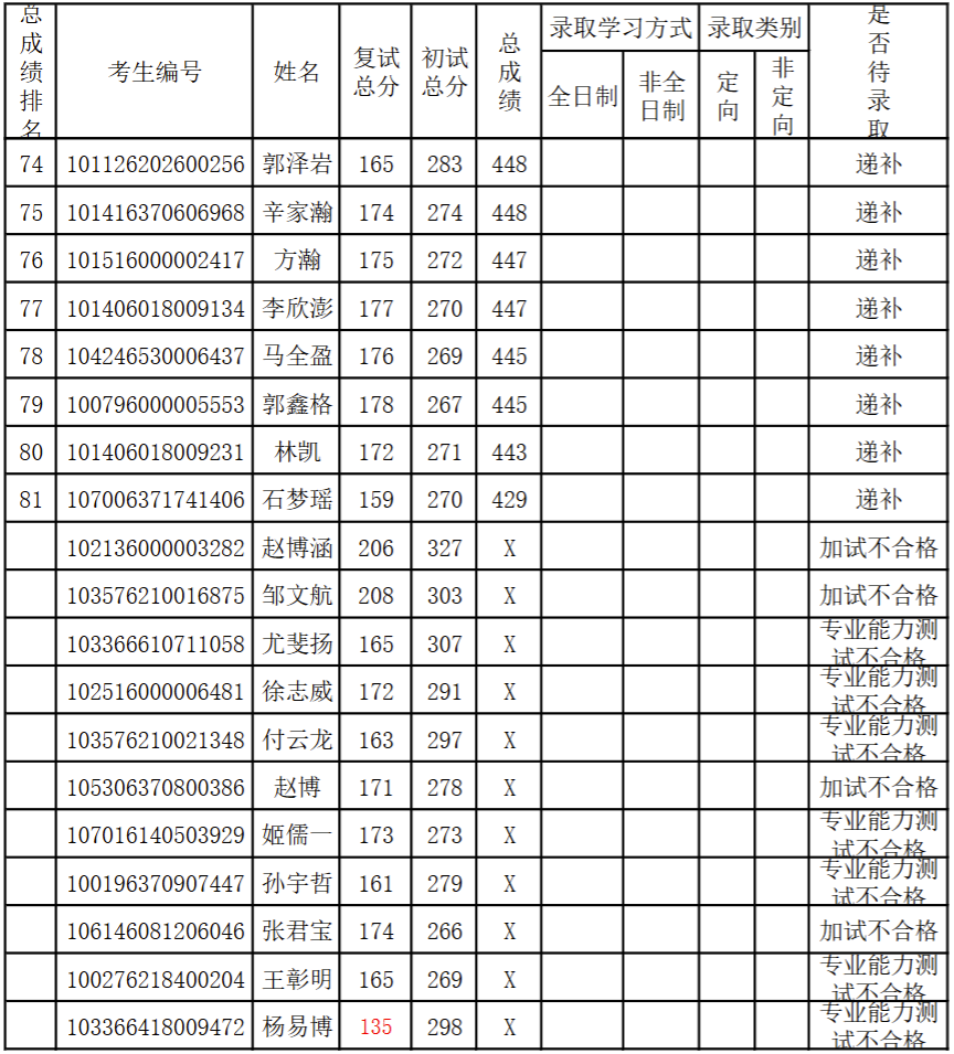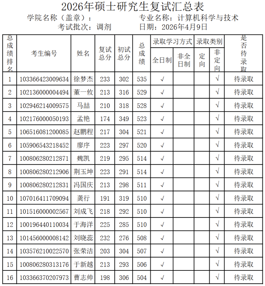 计算机与控制工程学院计算机科学与技术专业调剂结果公示
